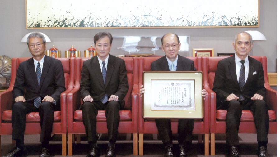 岡山大学学術研究院医歯薬学域(医)消化器外科学の藤原俊義教授(岡山大学病院 消化管外科診療科長)が,山陽新聞社会事業団より,がん撲滅に功績のあった個人・団体をたたえる「第30回松岡良明賞」を受賞しました。表彰式は9月8日,山陽新聞社で行われ,山陽新聞社社会事業団の桑原功理事長から表彰状と賞金が授与されました。表彰式には,山陽新聞社より松田正巳代表取締役会長,山陽新聞社会事業団より江見肇専務理事らも出席し,藤原教授の功績を顕彰しました。