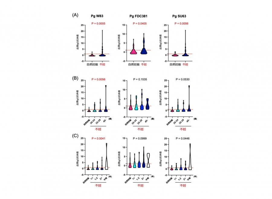 不妊治療患者群では歯周病原細菌であるPorphyromonas gingivalisに対するIgG抗体価が上昇している。(A)全体での解析,(B)年齢で分けた解析,(C)不妊期間で分けた解析
