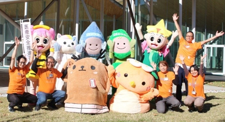 昨年のイベントに参加したゆるキャラたちと医療安全管理部職員