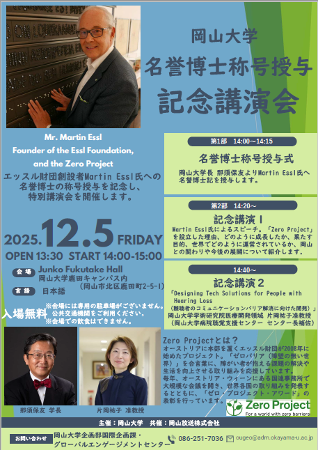 記念講演1では,Essl 氏が「Zero Project」を立ち上げた背景,その発展の経緯,目指す目的,世界での運営体制,さらに岡山との関わりや今後の展望について紹介します。