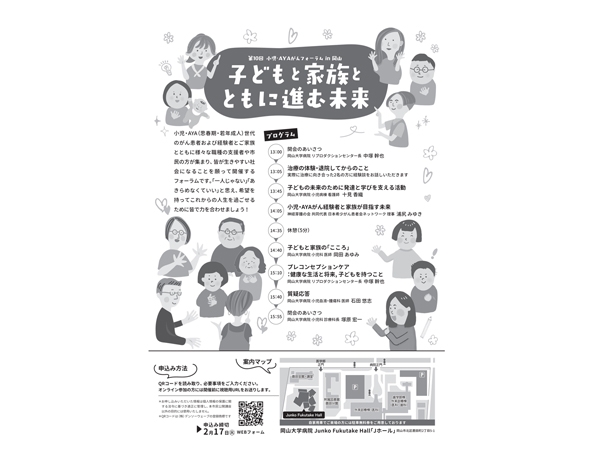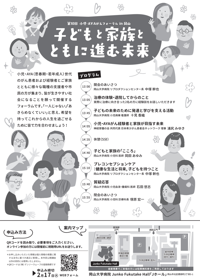 2月23日(月・祝)中国・四国広域がんプロ養成コンソーシアム市民公開講座「第10回 小児・AYAがんフォーラム in 岡山『子どもと家族とともに進む未来』」開催のお知らせ