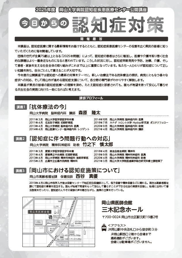 岡山大学病院認知症疾患医療センター公開講座『今日からの認知症対策』開催のお知らせ