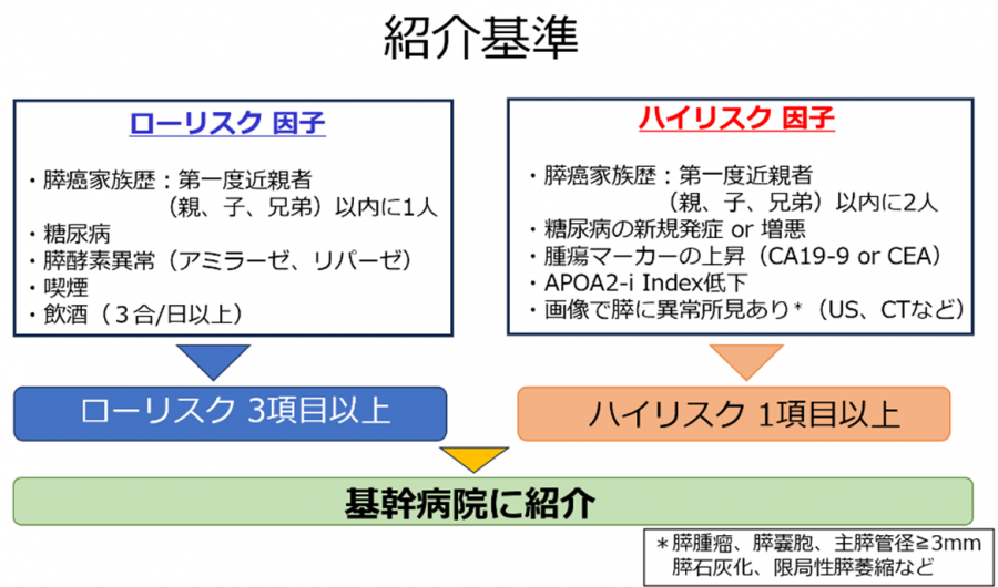 膵がんは発見や診断が難しく,予後不良な(治りにくい)がんであることが知られています。近年,早期の段階で診断し手術を含めた治療を行うことで,生命予後の改善につながる可能性があることが報告されています。無症状の段階で発見することが予後改善の重要な鍵となりますが,この実現には,地域全体でリスクのある方を拾い上げ,専門医療機関へつなぐ「病診連携(病院と地域の診療所との連携)」が不可欠です。