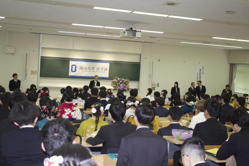 午前中には、全学の催しである令和7年度岡山大学学位記授与式が岡山県総合グラウンド体育館(シゲトーアリーナ岡山)にて開催されましたが、午後には、令和7年度法学部学位記等授与式が文・法・経済学部講義棟20番講義室にて執り行われました。