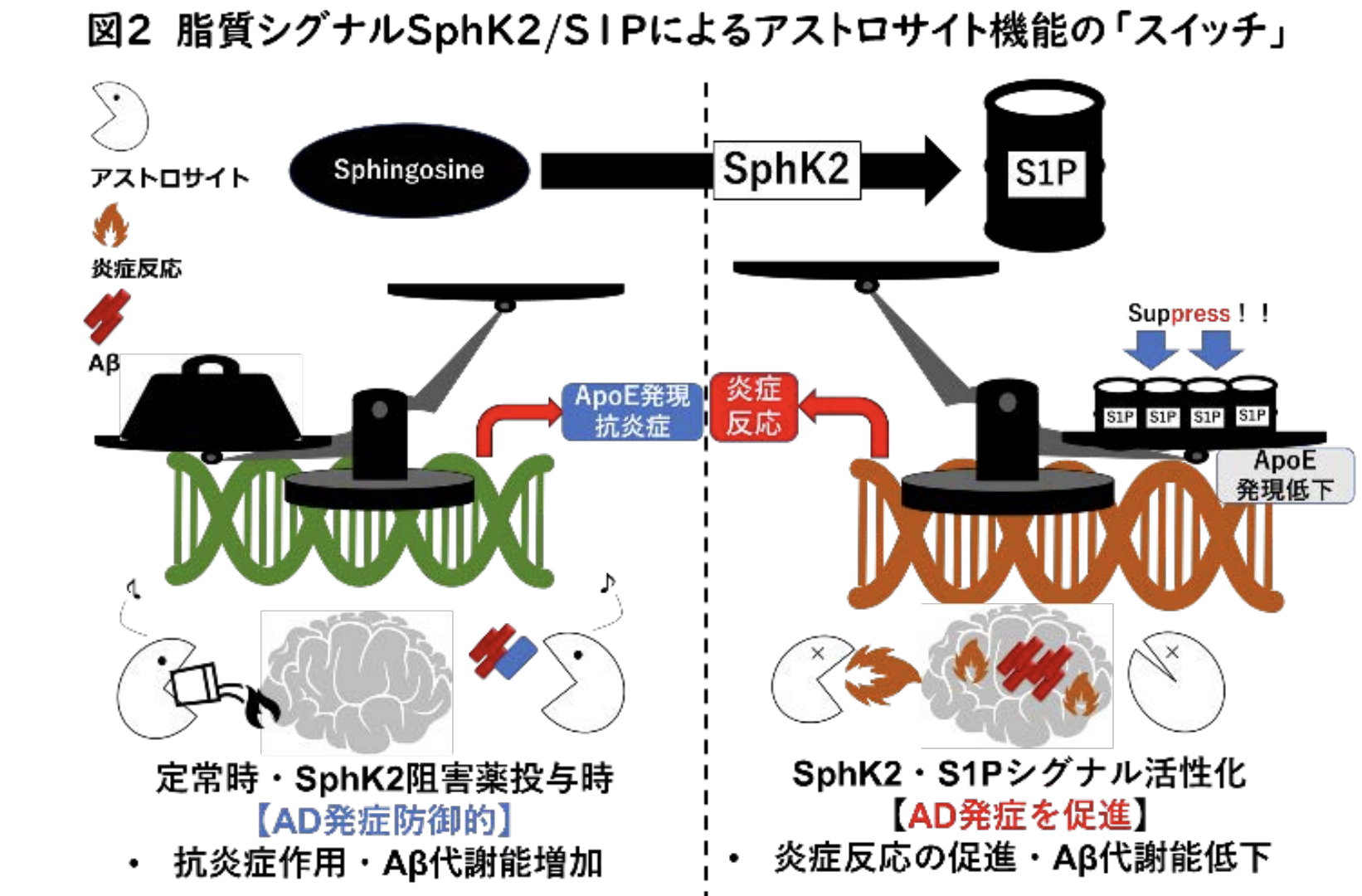 加齢はAD発症の最大の環境的リスクファクターですが,実際どのように脳内の生理機構に影響するかは不明であり,そのミッシングリンクに挑戦すべく,シグナル脂質,スフィンゴシン-1-リン酸(S1P),およびその産生酵素の一つであるスフィンゴシンキナーゼ2(SphK2)に着目して研究を行っています.SphK2/S1Pシグナルは中枢神経において免疫炎症反応を制御するとともに,その活性上昇が加齢とも密接に結びついていることが徐々に明らかにされています.我々は,SphK2の活性がAD患者脳で上昇しており,Aβの産生酵素の一つBACE1の活性を増加させることによりAβ産生を増加させ, さらにグリア細胞におけるAβ分解を促進する可能性を見出しています(Takasugi et al., J. Neurosci, 2011; Komai et al., J. Lipid Res, 2024).今後,同シグナルに基づいた多標的性の根本治療薬の開発を目指して研究を進めていく予定です.