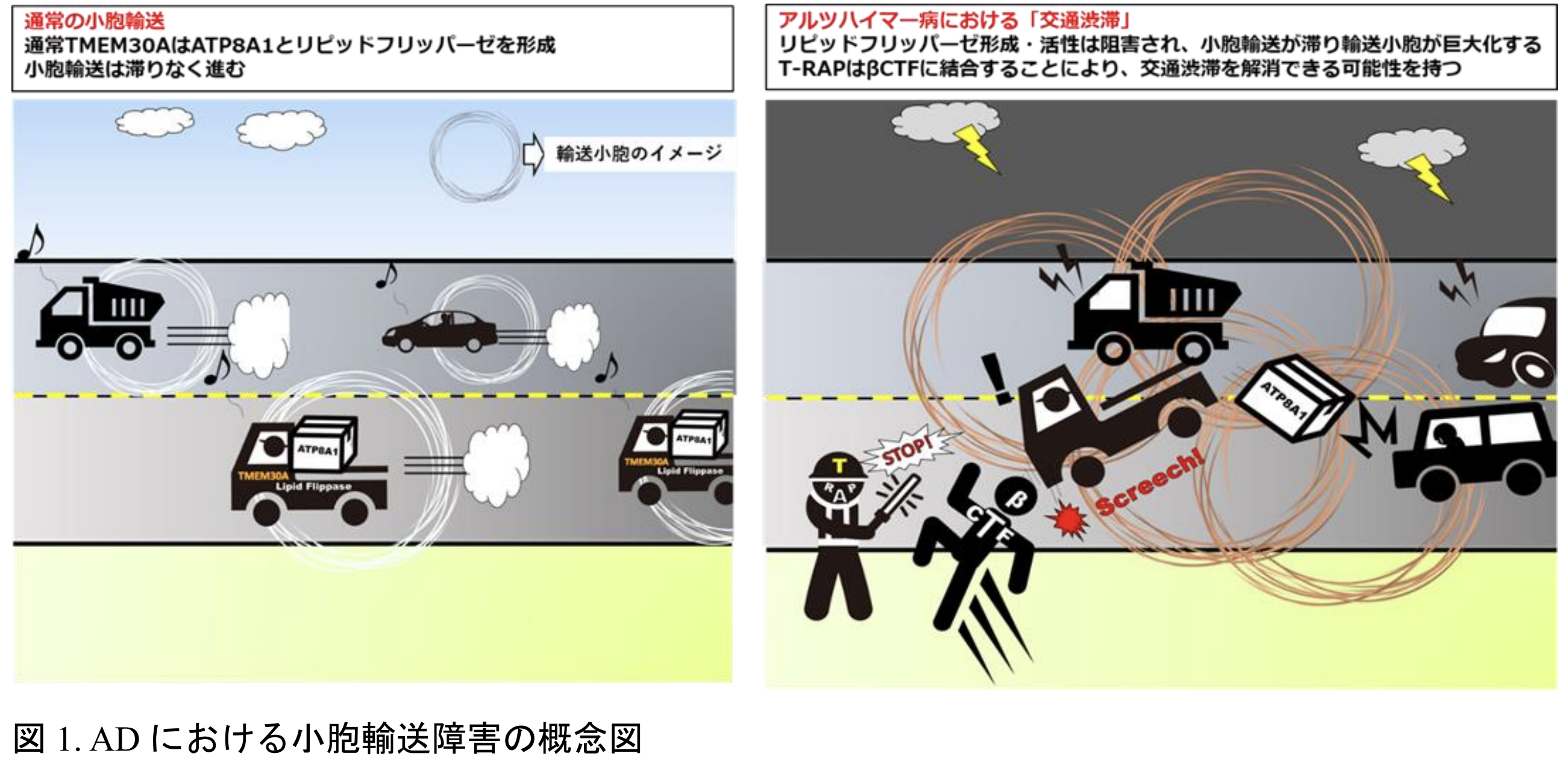 ADにおいて小胞輸送障害は病態最初期に起こると考えられており,我々のグループはAD関連タンパク質の一つであるAβ前駆体タンパク質(APP)由来代謝物であるβ切断カルボキシ末端断片(βCTF)がエンドソームに集積し,脂質の膜内運搬酵素の構成因子TMEM30Aとの結合により輸送障害が起こるとする新たなAD発症モデルを提唱しました(Takasugi et al., PLoS ONE, 2018; Kaneshiro et al., iScience. 2022).今後,TMEM30AとβCTFの結合を阻害できる化合物の同定などにより,ADにおける病態特異的小胞輸送障害を改善という新たなコンセプトに基づいたAD根治療法の開発につなげたいと考えています.