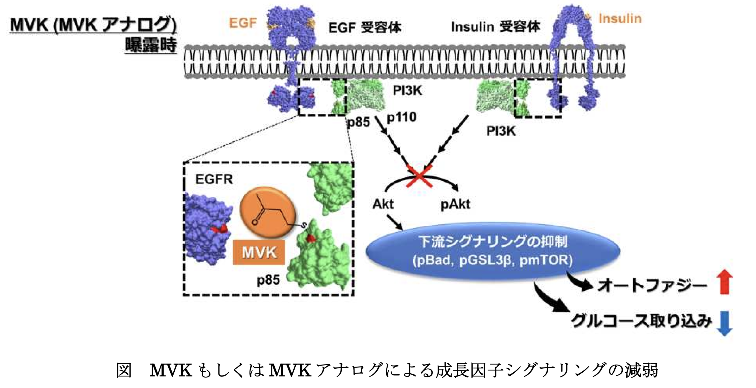 親電子物質は電子が不足し,反応性に富んだ物質です.これらの物質は大気や水,土壌など生活環境中にさまざまな有害物質として存在しており,人々は多くの親電子物質に日々曝露されています.親電子物質はタンパク質中の特定のアミノ酸(システイン,リジン,ヒスチジン)残基と共有結合し,標的分子の機能変化を介してがんや炎症,神経変性疾患の原因となることがこれまで明らかにされています.しかし,その分子メカニズムについては未だ不明な点が多く残っており,早急の解明が必要とされています.私達の研究グループはこれまでに1,2-ナフトキノン(1,2-NQ)が上皮細胞成長因子(EGF)受容体を選択的に活性化することで細胞死を抑制することを突き止めました(Nakahara et al., J Biol Chem., 2021).最近では,メチルビニルケトン(MVK)がホスファチジルイノシトール3-キナーゼ(PI3K)に結合し,インスリンやEGFの作用を抑制することを明らかにしました(Morimoto et al., J Biol Chem., 2024).