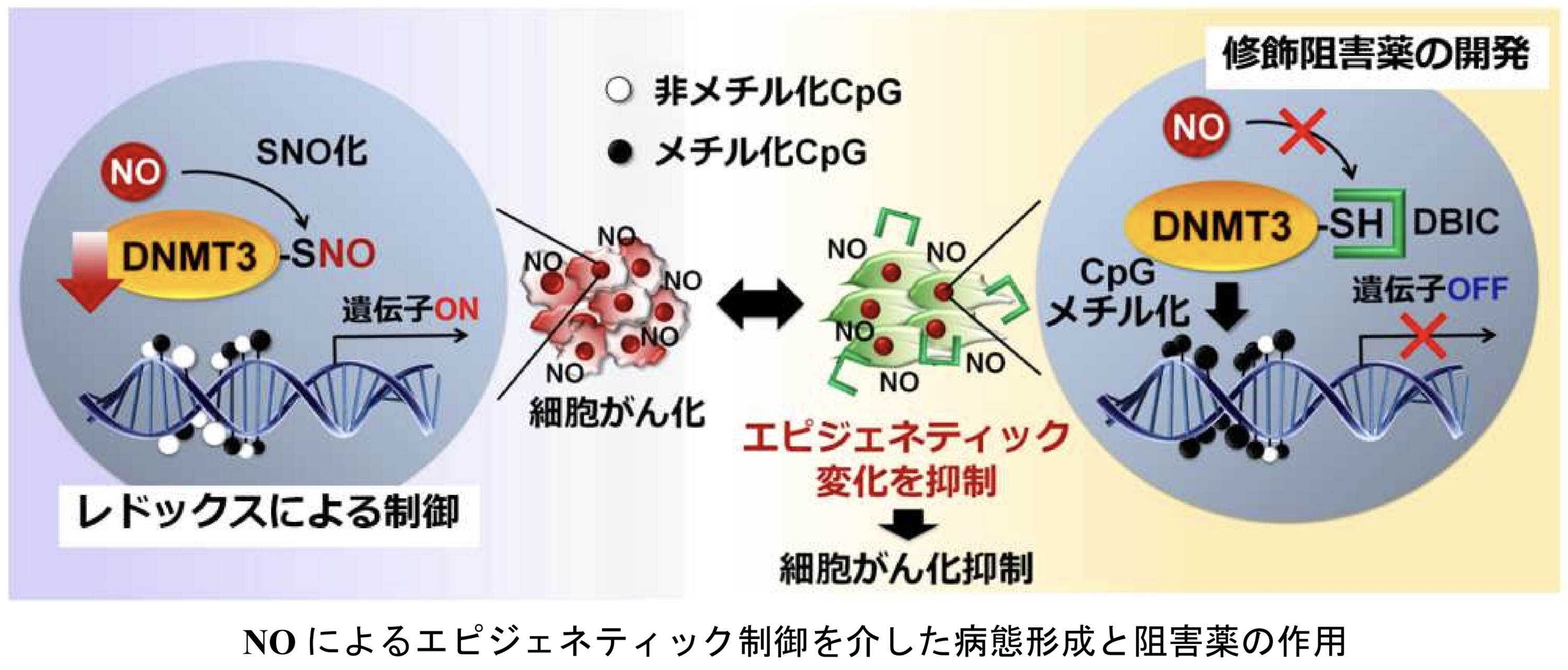 私たちはこれまでに複数のS-ニトロシル化されるエピゲノム関連酵素を同定しており,これらの酵素の遺伝子発現制御機構への影響を解析してきました.特にDNAのde novoメチル化を担うDNAメチルトランスフェラーゼ(DNMT)3BがSNO化による活性調節を受け,DNAメチル化の異常を引き起こすことを明らかにしました.また炎症部位ではNO産生が顕著であり,炎症によりパーキンソン病,アルツハイマー病,癌の発症が起こることが知られています.現在はこれらの病態とNOの因果関係を明らかにすべく,研究を行っています.