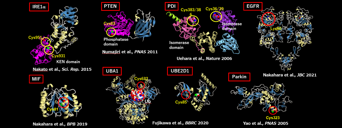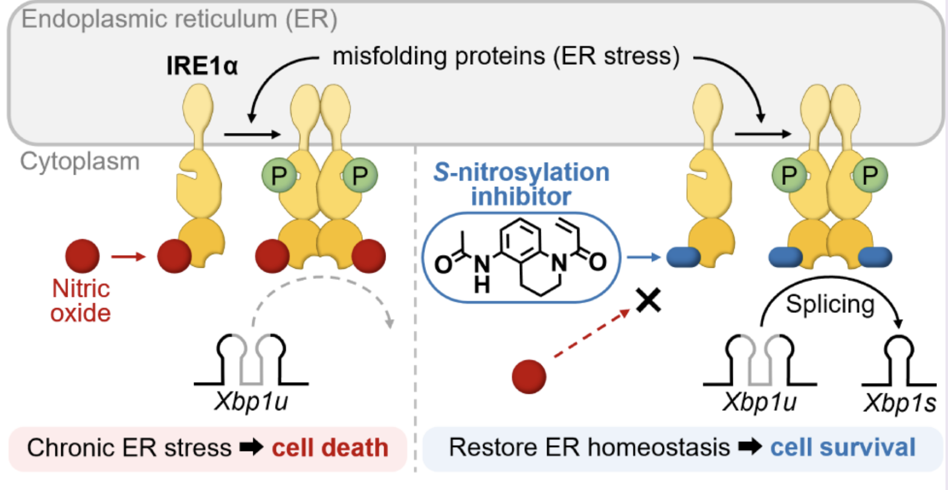 近年,IRE1の立体構造から,SNO化によるRNase活性阻害をを抑制する新規化合物を同定することに成功しました(Kurogi et al., ACS Chemical Biology, 2024).本化合物を用いて,IRE1のSNO化と病態形成との因果関係を証明し,創薬へと応用していきたいと考えています.
